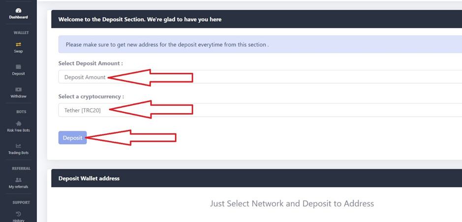 · Then, click on the "Deposit" option to reveal the wallet address to which you should transfer your amount, and you can transfer your amount to that wallet.