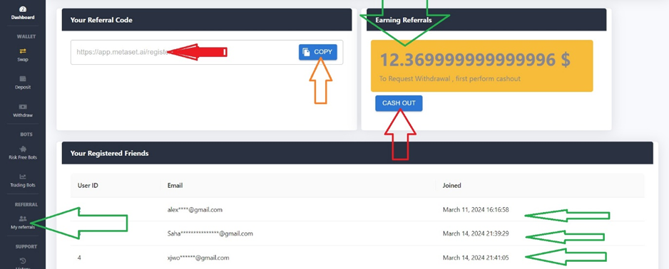 2. You can transfer your referral earnings to your Metaset account using the "CASH OUT" button and withdraw your earnings through USDT TRC20 or TRX without any limitations.